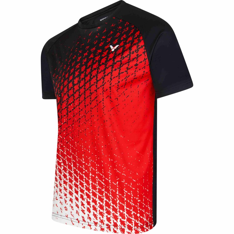 The Victor T-Shirt Unisex T-33105 CD Black/Redis a well-ventilated functional badminton shirt with unisex fit for men and women and has a nice black/red design. Rising moisture is immediately brought to the surface, leaving you feeling nothing but a fresh feeling.